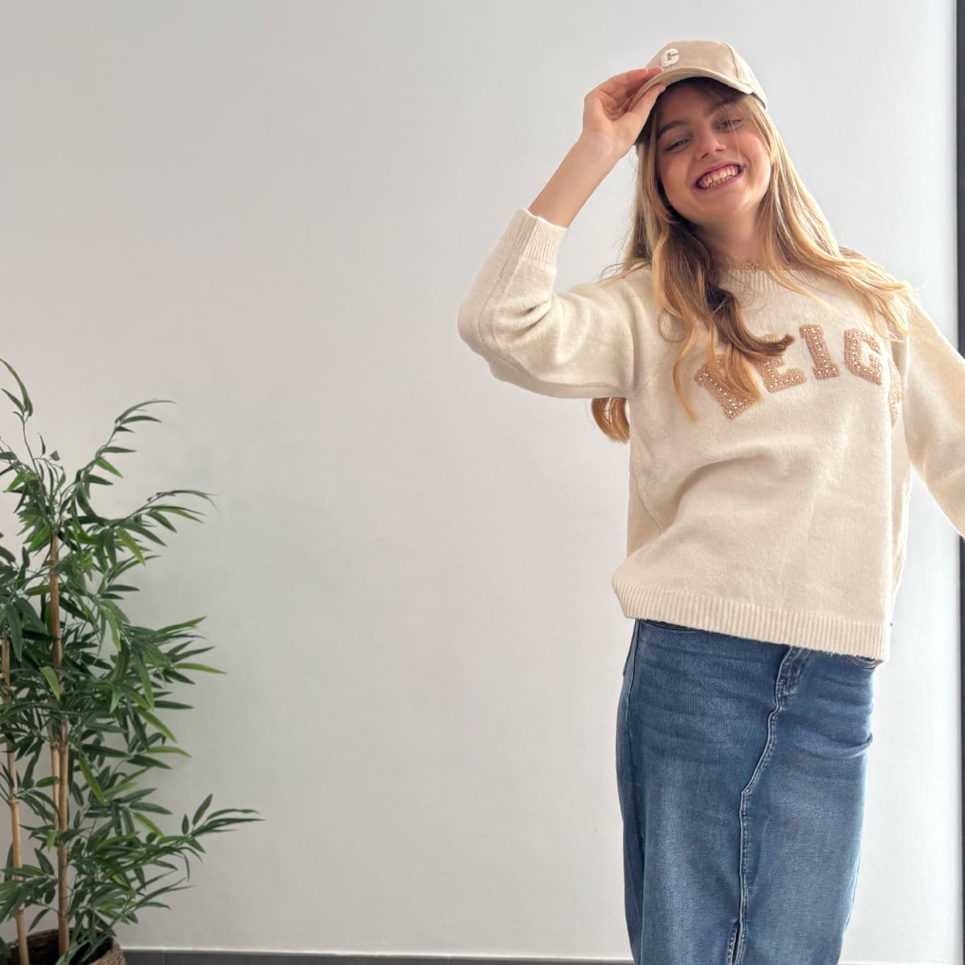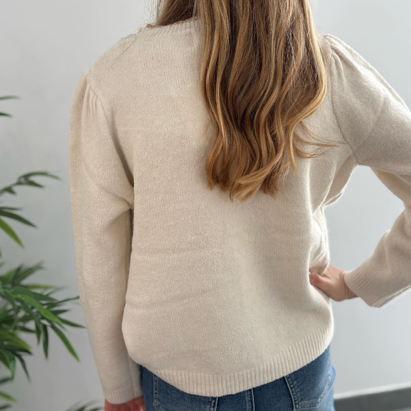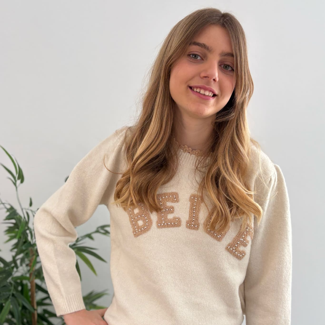 Jersey Beige abalorios. Este jersey, con su estilo cómodo e informal, es perfecto para combinar con cualquier prenda de tu armario. Ya sea con unos jeans para un look casual, o con una falda elegante para una salida más formal, su diseño atemporal y el toque de brillo proporcionado por los abalorios lo convierten en una opción ideal. La combinación de comodidad y elegancia hace de este jersey una prenda esencial, capaz de elevar tu estilo.